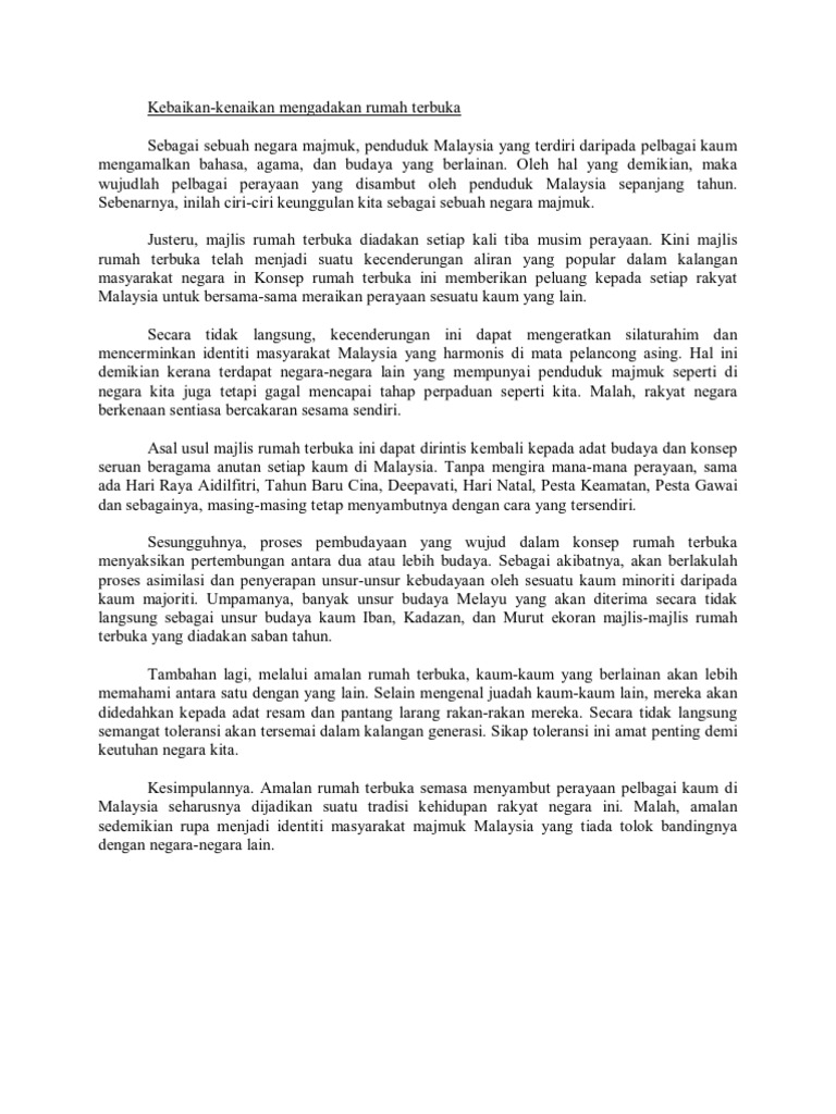 Amalan rumah terbuka semasa menyambut perayaan pelbagai kaum di malaysia seharusnya dijadikan suatu tradisi kehidupan rakyat negara ini. Kebaikan Amalan Rumah Terbuka Karangan Spm Faedah Mengadakan Rumah Terbuka Pada Hari. Bapa Ali memberi saya duit raya.